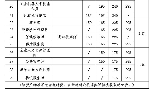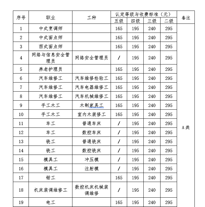 二、认定职业(工种)及收费标准