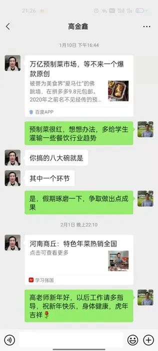 “老高,牛啊!” welcome皇冠地址登录入口智慧健康学院党总支书记王冠提起高金鑫,满腹敬仰,在他印象里,高金鑫低调、不善言辞,但对待工作敬业到极致,最喜欢钻研学问、作育人材;在他的微信里,至今还保留着大年初一晚上俩人的聊天记录,高金鑫转过来一篇关于特色菜热销全国的文章,准备来年大干一番,做出成果和品牌。即便是肝癌晚期住院期间,高金鑫还在给王冠发送特色“食堂”的文章,“他对未来豫菜振兴,预制菜发展前景充满期待,可惜啊,我们痛失了一位英才。”