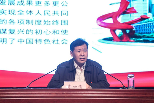 李四清指出,当下我们幸福安定的生活,来源于我们有一个强大的政党,一个强大的国家,正是因为中国共产党始终坚持不忘初心,牢记使命,才有现在国家的繁荣富强和稳定和平。他从理论维度、历史维度、实践维度和当前实际工作维度四个维度,深刻解读了中国共产党的初心和使命就是为中国人民谋幸福、为中华民族谋复兴。